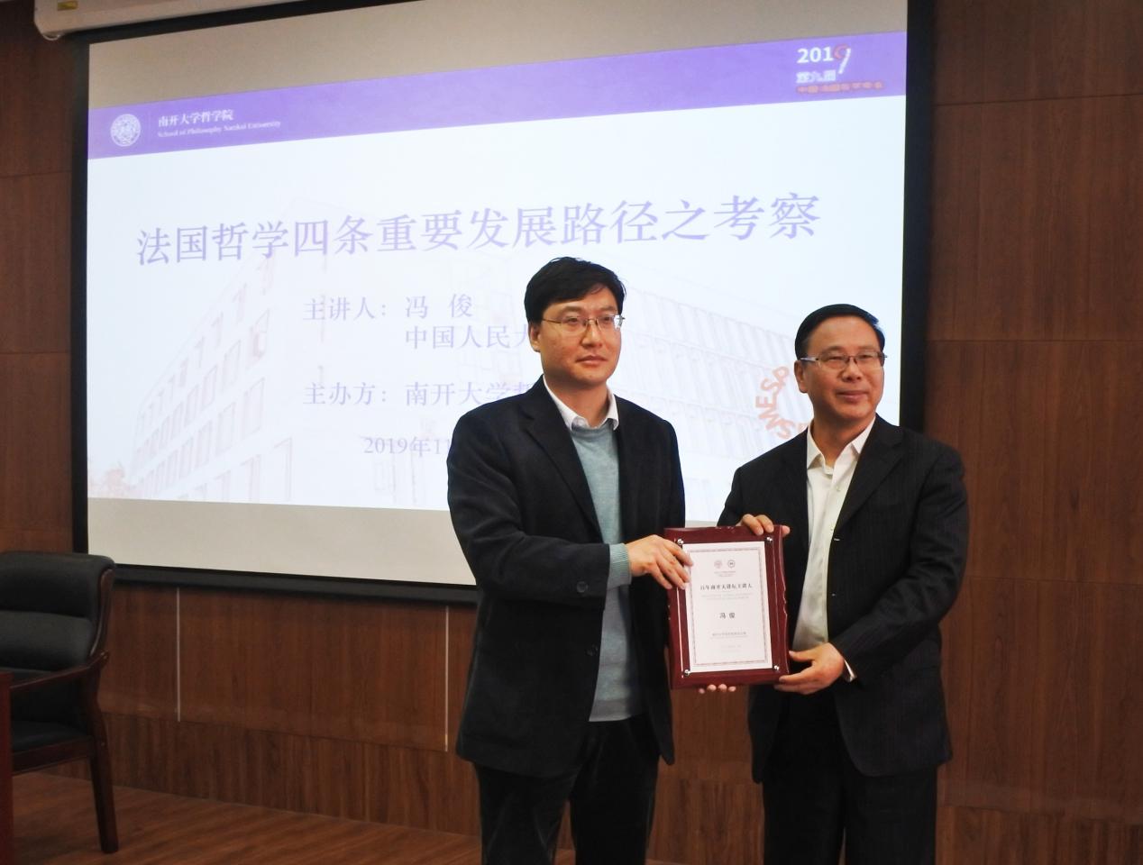 (通讯员 张尚尚 摄影 王江雨)2019年11月8日下午,中国人民大学冯俊教授做客“百年南开大讲坛”,并于体育365官网318会议室展开题为“法国哲学四条重要发展路径之考察”的报告。会议由体育365官网贾江鸿教授主持,体育365官网教师王建军、张仕颖、齐艳红、莫雷出席论坛,在读博士生、硕士生到场参与讨论。(体育365官网负责人贾江鸿向冯俊颁发“百年南开大讲坛主讲人”证书牌)主讲人冯俊以法国哲学的四条发展路径为线索,以宏观的方式讲授了法国哲学发展史。冯俊的讲座内容丰富,其主要内容概括起来可以分为以下四点:一是理性主义和科学主义的发展路径;二是理性主义和非理性主义;三是社会政治哲学和马克思主义哲学;四是现象学运动与后现代主义哲学。会后,冯俊与在场师生进行了热烈的探讨。冯俊勉励同学们学贯中西,以西方哲学注释中国哲学,发扬我国的传统文化。“搞哲学的人,要有一辈子为真理献身的精神”,引起了与会师生的共鸣。